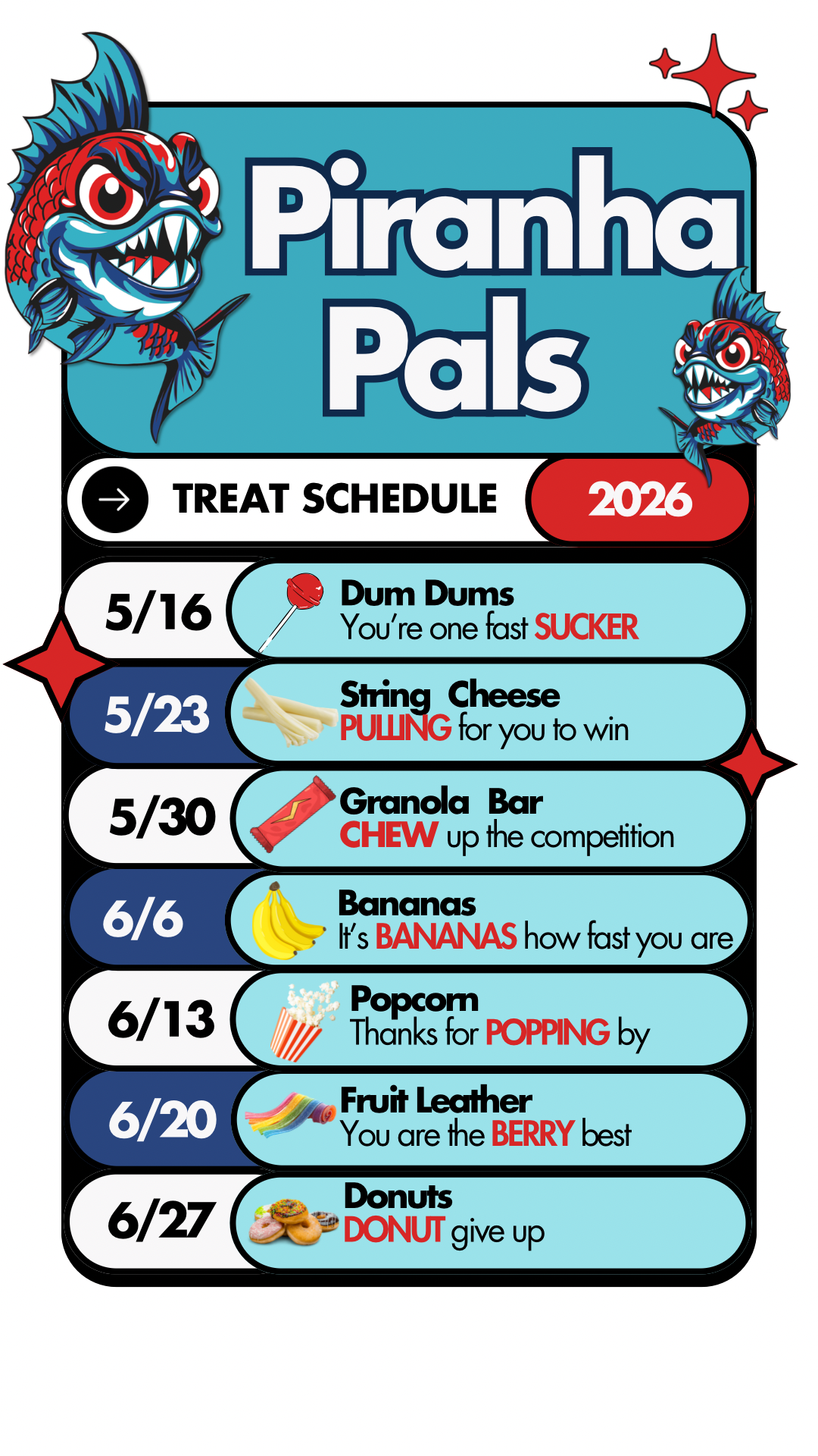 Piranha Pals - Our program is all about building friendships among swimmers by pairing them up for a season overflowing with fun! This season we will have a social table at all swim meets with an established Pal schedule.